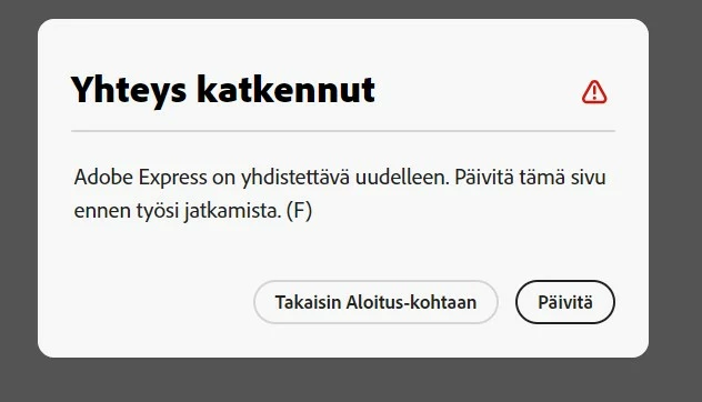 En pääse aloittamaan uutta työtä tai muokkaamaan vanhaa, koska joka kerta kun avaan työn, ilmestyy ponnahdusikkuna jossa lukee "Yhteys katkennut. Adobe Express on yhdistettävä uudelleen." Sivun päivittäminen ja tietokoneen uudelleenkäynnistys eivät korjaa asiaa.