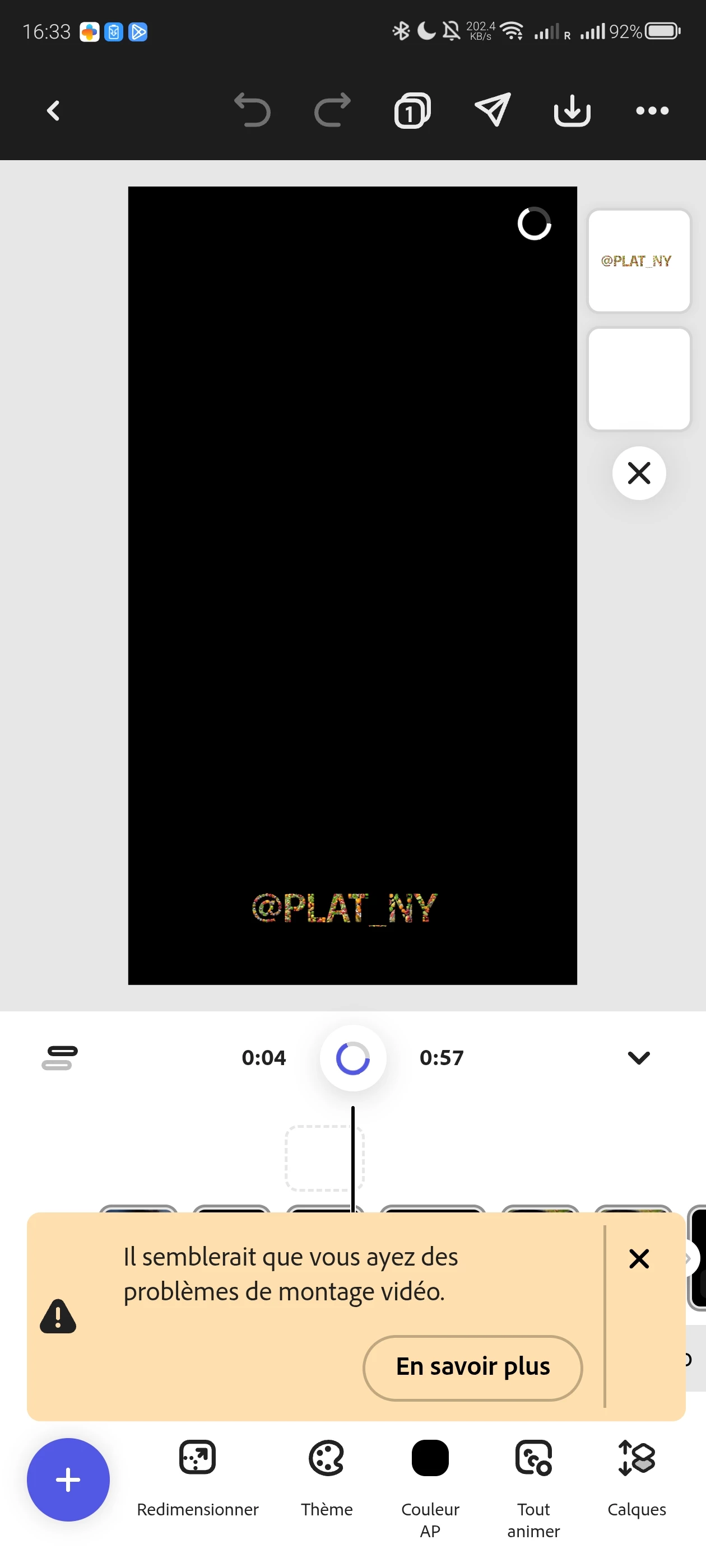 Quand je réalise certain prochain et que je sors de adobe express je perds la moitié de mon projet. En effet le montage et la répartition est correct mais adobes n'arrive pas à charger les vidéos pour continuer le projet. Voir photo.