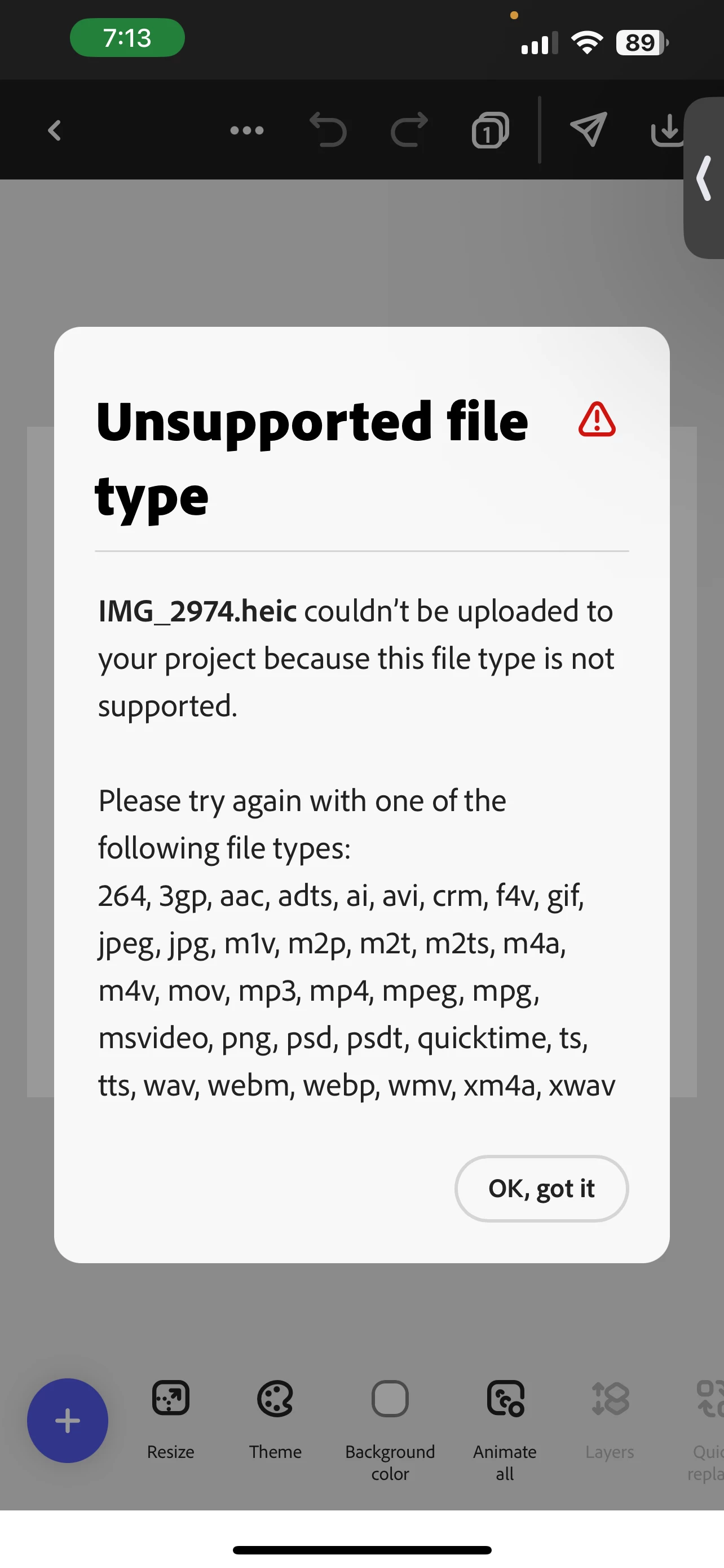 unable to upload any photos into express. I get this error no matter what type image I use. I've restarted my device, checked for updates, even took random photos with my phone. Videos appear to still work but photos are a no go.