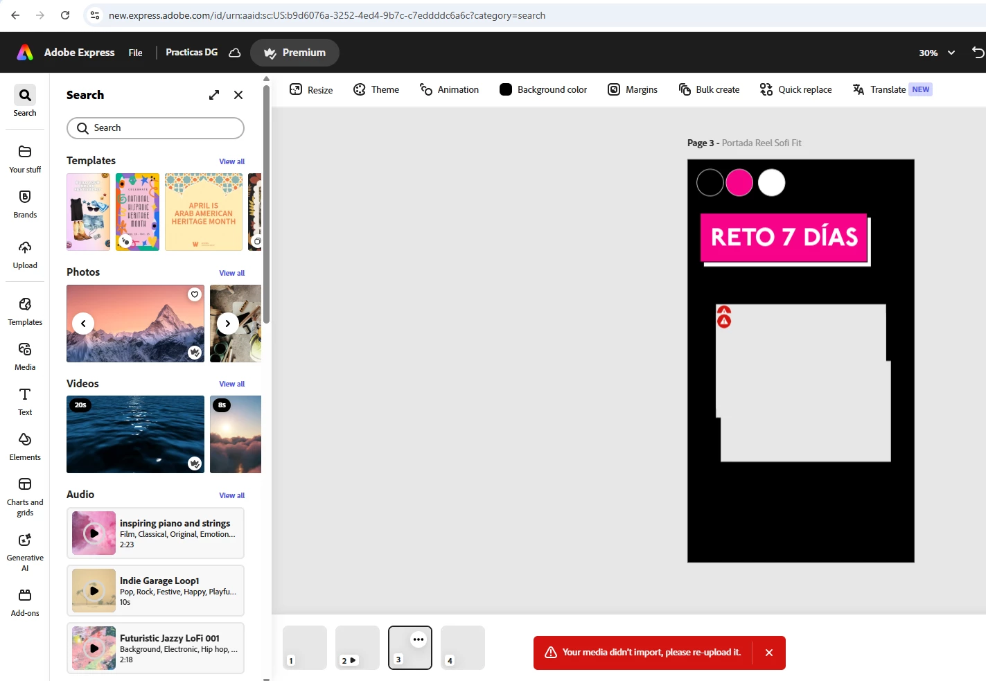 Estoy trabajando desde ayer con Adobe Express y funcionaba bien pero de repente no me dejó cargar imagenes, no me deja subir desde mi pc ni cargar las de stock. Me sale el cartel de "Your media didn´t import, please re-upload it"