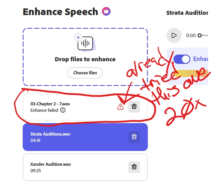 Adobe Podcast failed to upload file.....endlessly