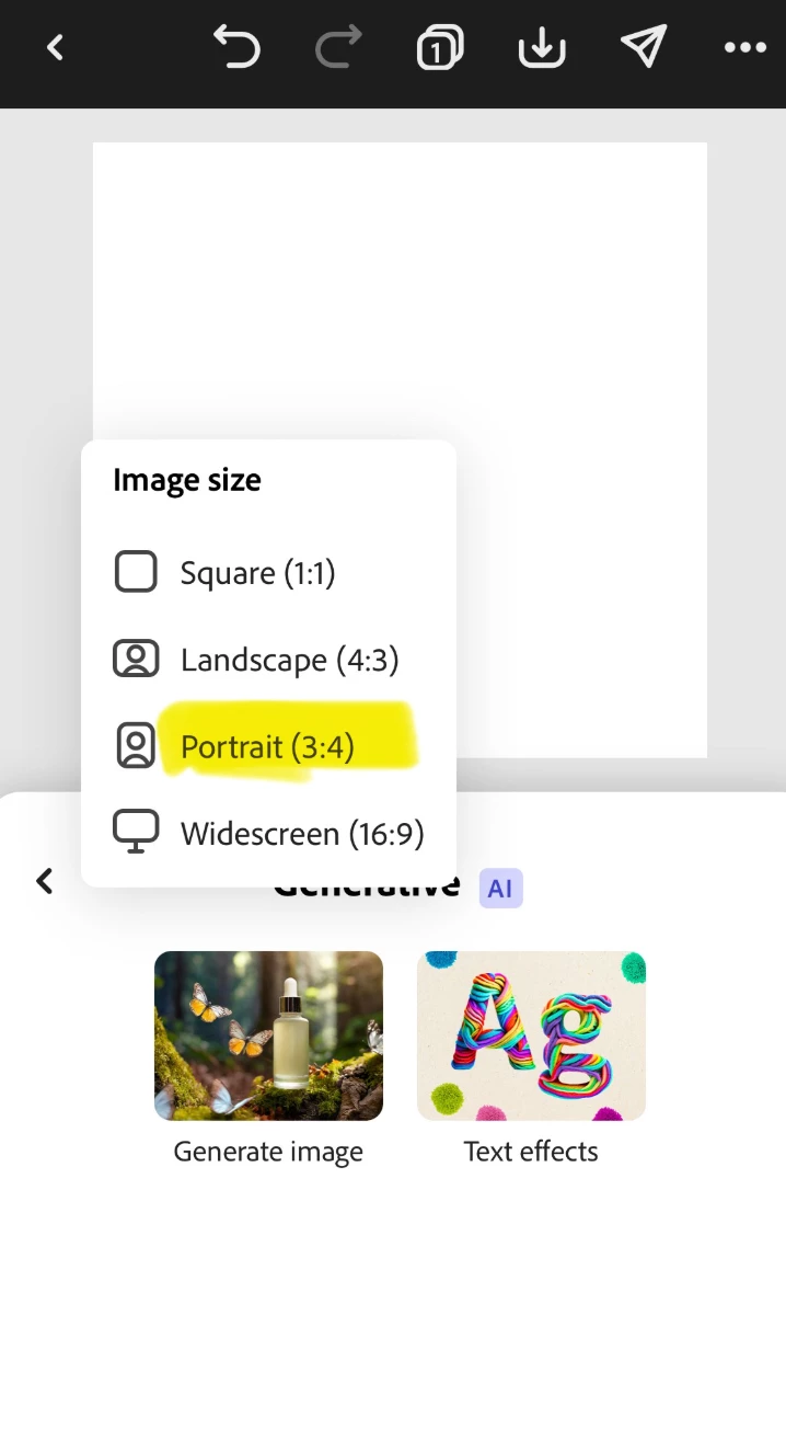 Hi! When I ask Adobe Express for iPhone to generate an image, it generates something that look like an standing A4, with some white pillars at the sides. If I download or resizes the image, the white pilars are still there.