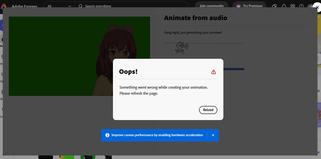 Ddefault34006205qnjgdaParticipantForum|Forum|2 years agoDecember 3, 2023animate from audioForum|Forum|2 years agoDecember 3, 20231 reply99 viewsshowing always something wrong while processing attached screenshotVideoExporting and Sharing