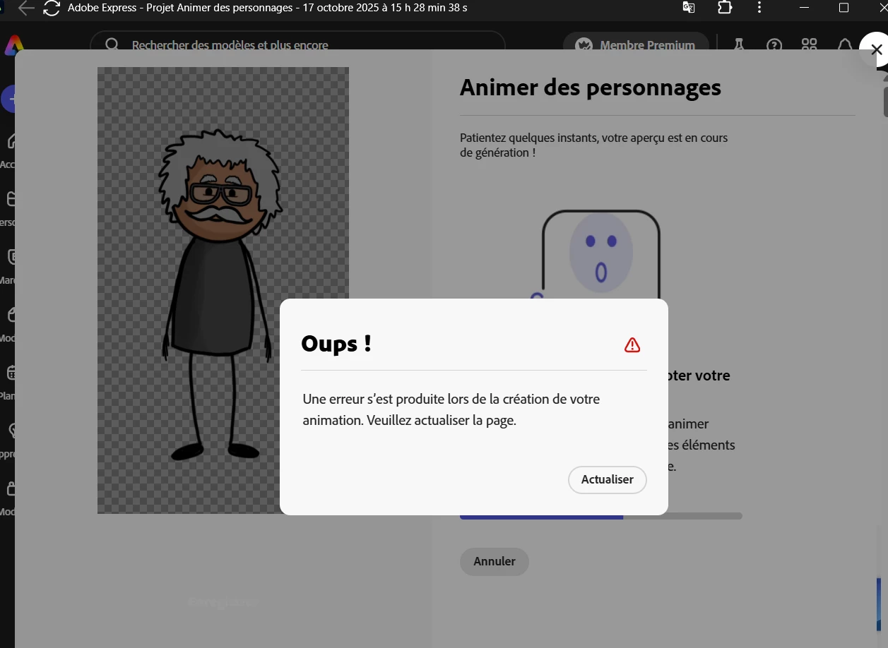 Voici le message qui s'affiche alors que j'essaye de générer. J'ai essayé beaucoup de choses. Changer de navigateur, effacer les caches, passer par l'application, changer la durée, bref plein de choses et rien qui fonctionne et toujors ce message d'erreur. Peut-on m'aider, SVP. Merci