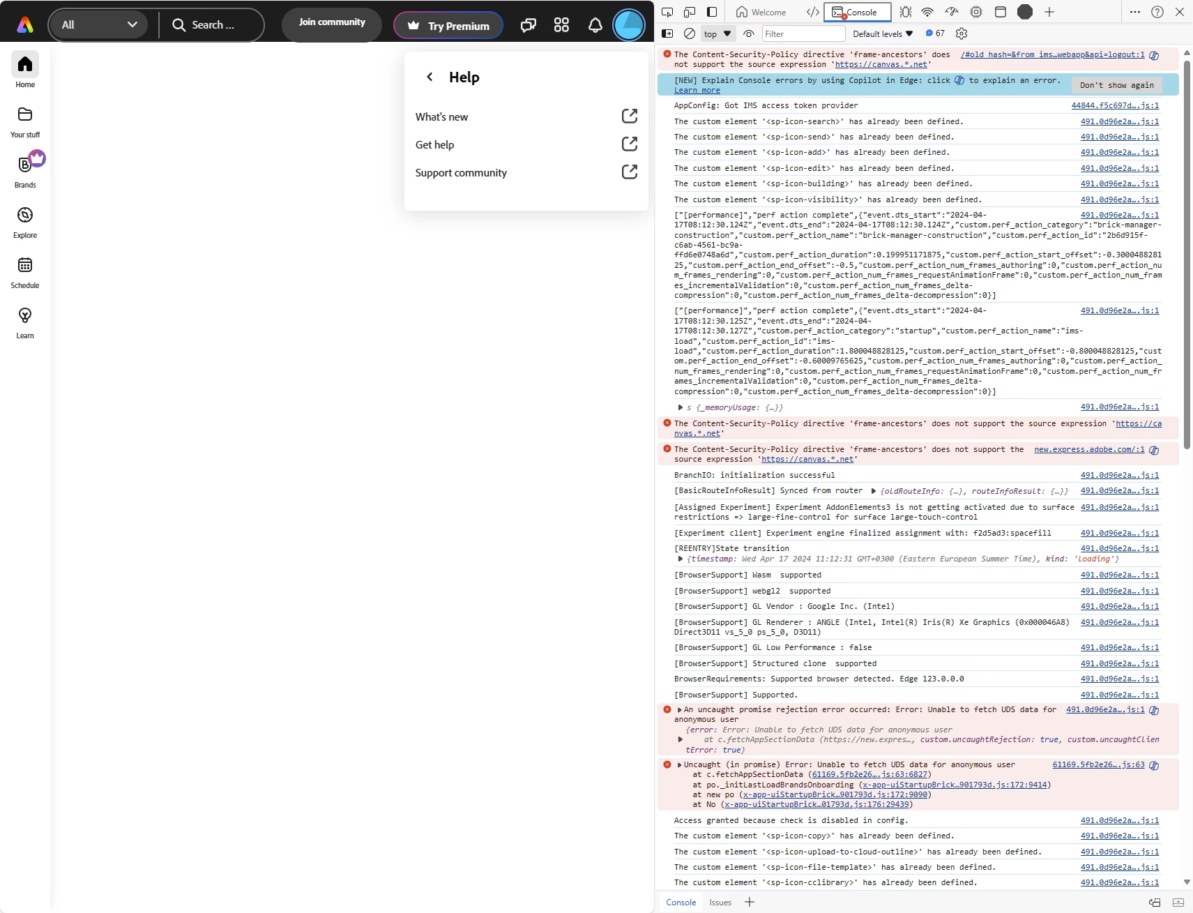 Cant open Adobe Express on a Mac in Chrome or Safari. logged out and back in, cleared browsers history. just spins and spins