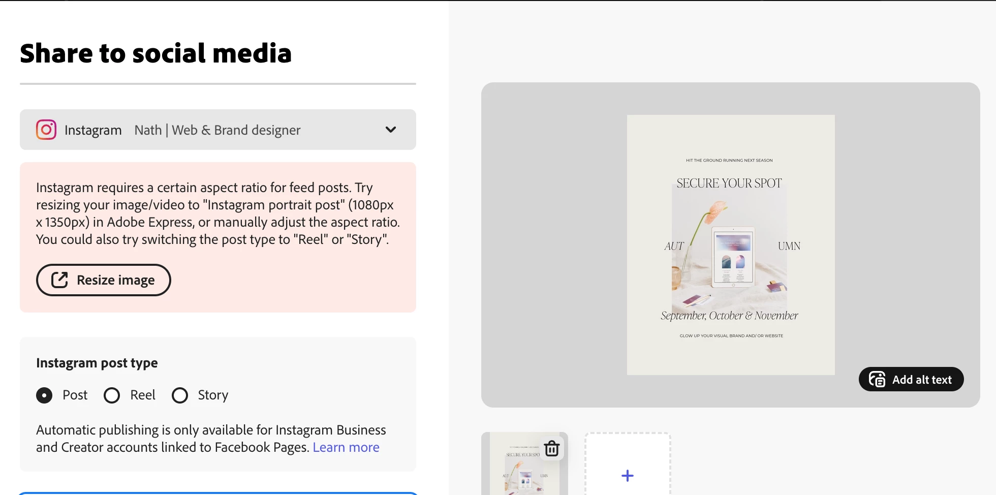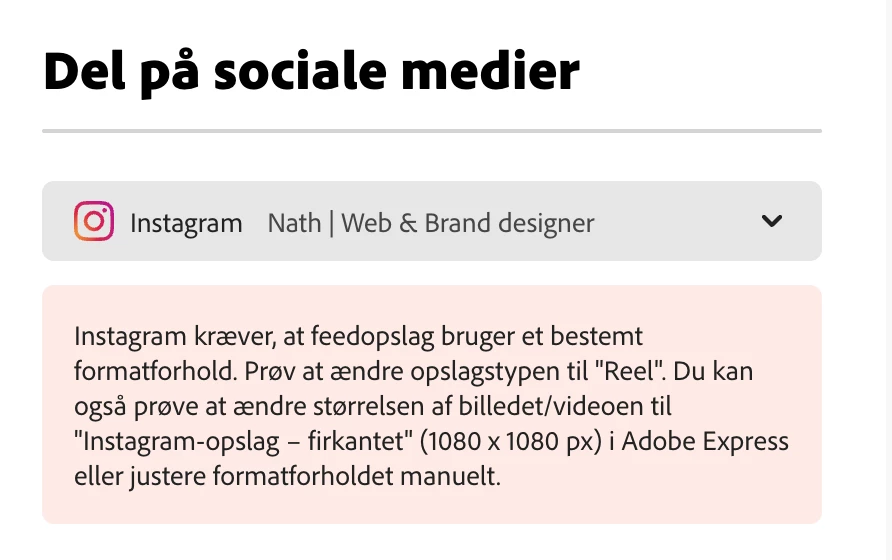 Bug in Adobe Express Instagram scheduling? regarding post size