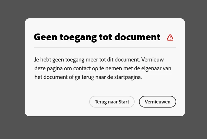 I'm working with custom made templates (sjablonen in Dutch) in Adobe Express. We've created our own Templates in our own housestyle. But when I use a template to create a document and work in it, I very often get the below message. The English translation is: