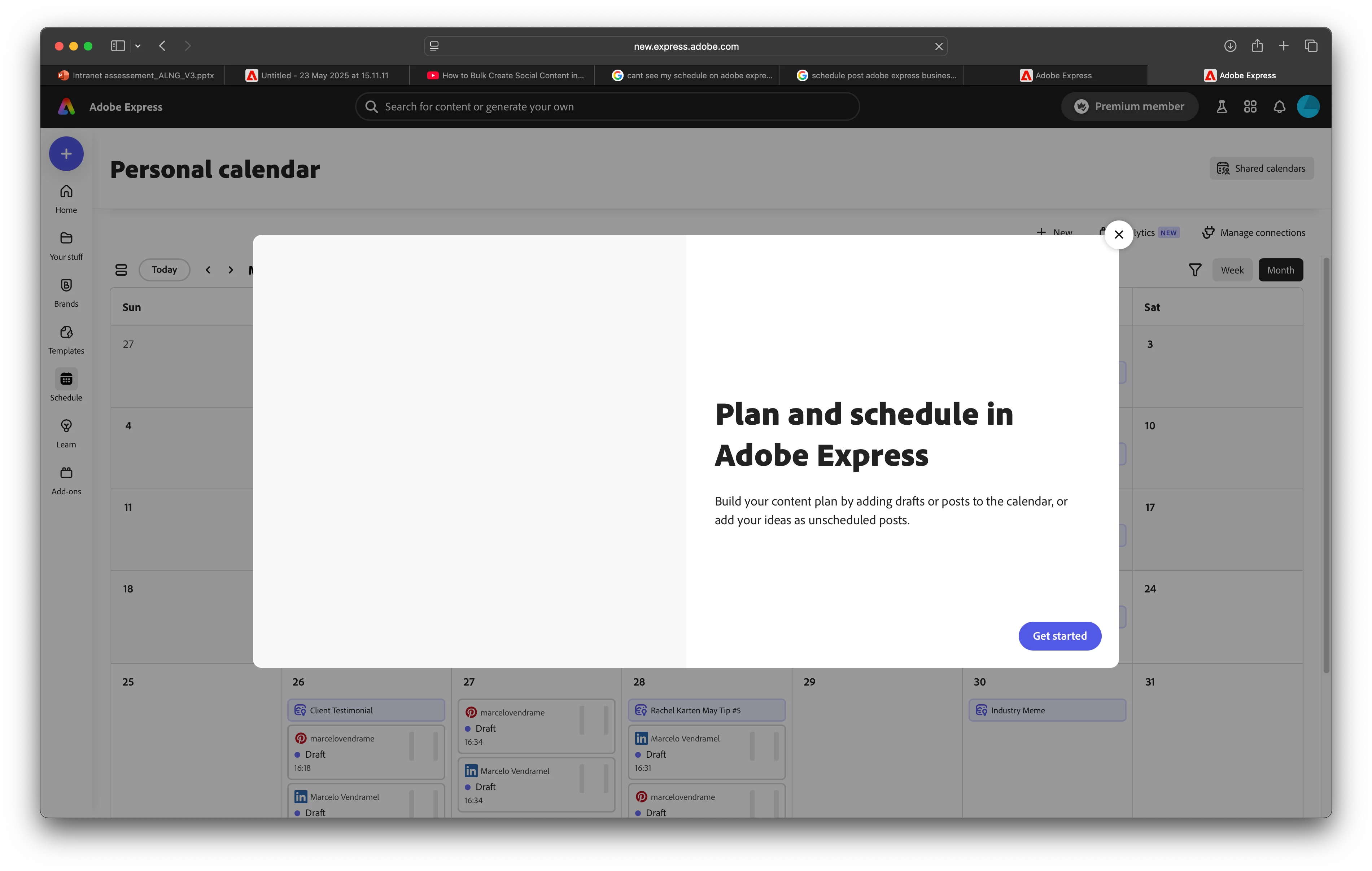 I'd like to understand why the schedule feature ins't showing on my account. On Share button I can connect to social media, share posts, drafts, etc. But when I go back to Adobre Express home and click on Schedule the calendar calendar quick opens (image below), then it sudden redirects to Adobe Express home. So I cant access and manage the calendar.