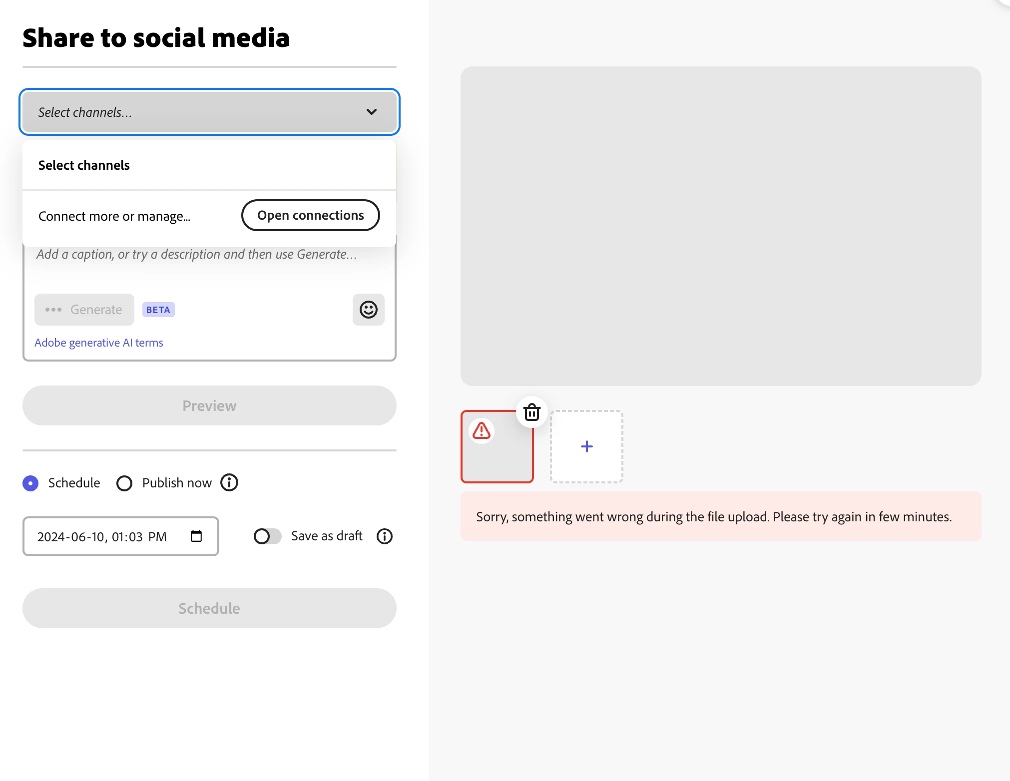 Been getting this message all morning (see attached screen shot). Nor can I get any social channels to connect. I was very excited to start using this app to exclusively manage my social media design and scheduling, but so far nothing is working, i've spent hours troubleshooting and going on help forums with no success so far.