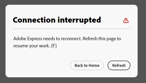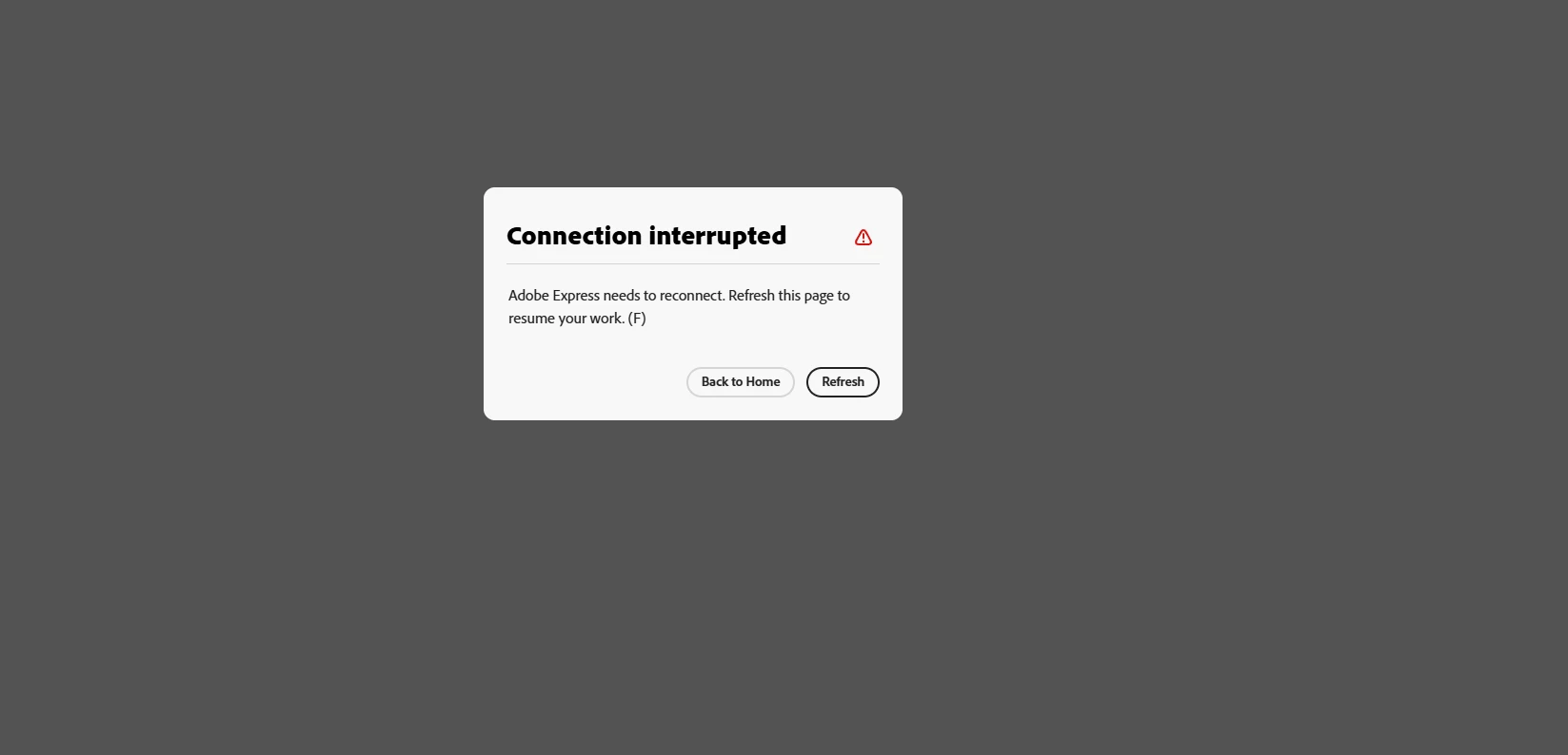 ''Adobe Express needs to reconnect. Refresh this page to resume your work. (F) ''.  I always get this error message. Please help.