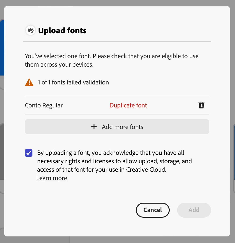 I am not able to remove an incomplete custom TTF font I uploaded. It deletes from my Express Brand space, but its replacement font -- an OTF font -- cannot be uploaded. It identifies the OTF font as a duplicate but gives no option to replace the existing one. This is a bug. Now, I cannot use this font. (see attached images)