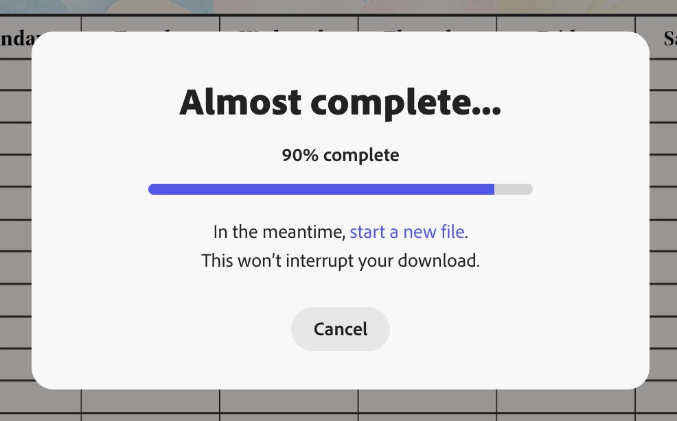My file does not download from Adobe Express. When I try to download it in PDF format, it keeps loading at 90%. My file has 31 pages, and I would like to download it as a single PDF file, but it is still stuck at 90% loading. Even when I try to download each page individually, only three pages can be downloaded in PDF format.
