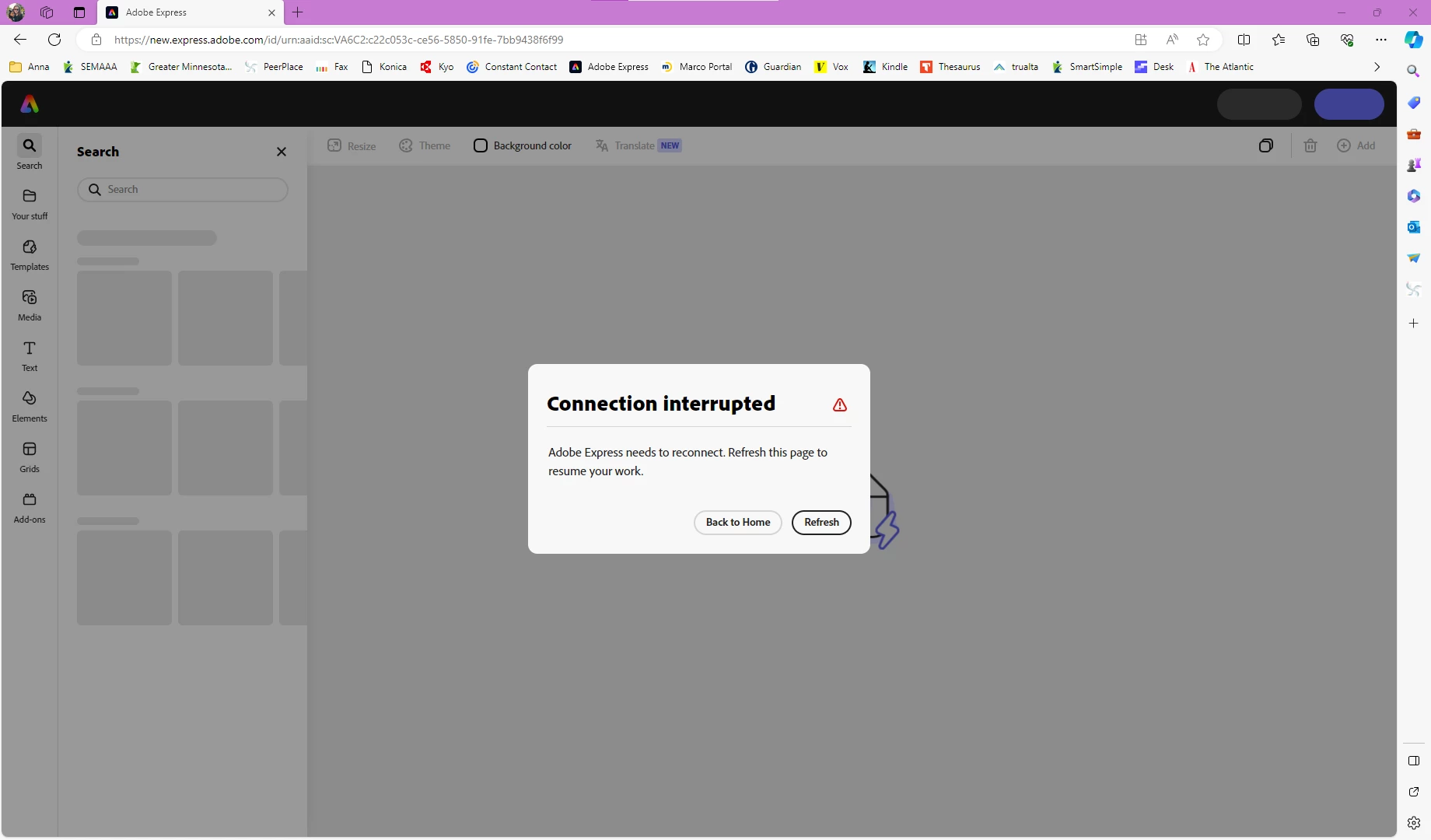 Hello, when I try to open any item in Adobe Express, the following message appears. Very frustrating, as I'm attempting to work on our organization's newsletter - the sole reason I pay for this softwar - and am completely unable to do so. Please help!