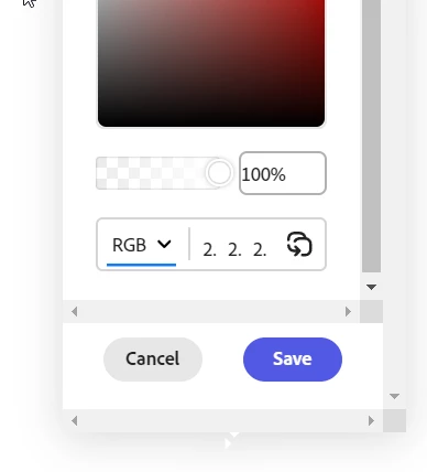 Go into brands and color swatch. Half the time the palette is off the screen, have to zoom out in Chrome to see it. Can't resize the palette. Half of it is cut off. Change to RGB values input and it only shows one number for each value. Have to input and wait to see if it was put in correctly.