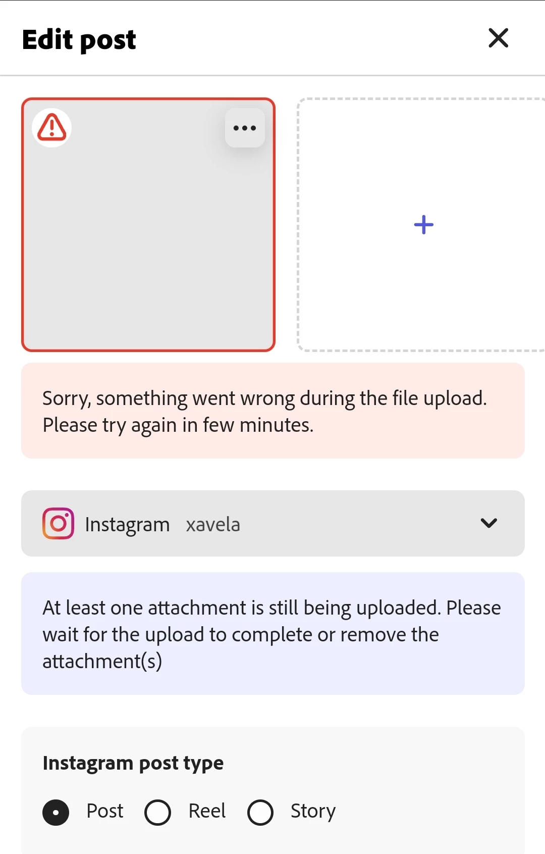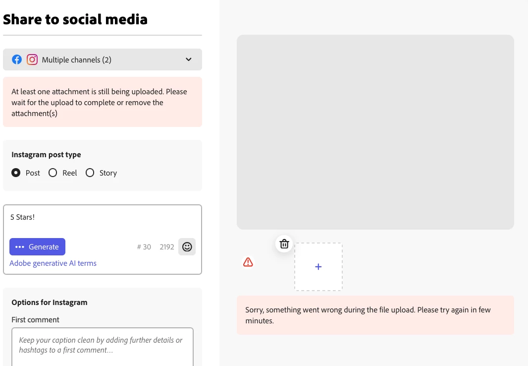 I have been receiving the error shown in the screen shot below for the last two days every time I attempt to upload media to a post in the Adobe Express Scheduler.