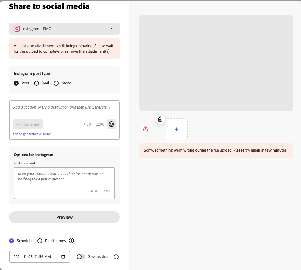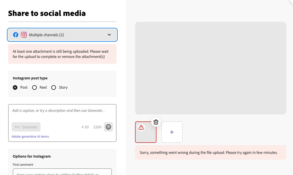 I have been receiving the error shown in the screen shot below for the last two days every time I attempt to upload media to a post in the Adobe Express Scheduler.