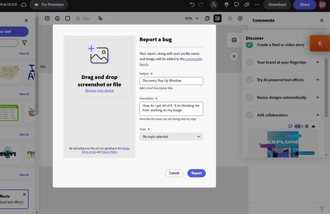 BBob36040103jm19ParticipantForum|Forum|2 years agoMarch 13, 2024Discovery Pop Up WindowForum|Forum|2 years agoMarch 13, 20241 reply90 viewsHow do I get rid of it. It sis blocking me from working on my image.Desktop WebSocial Media
