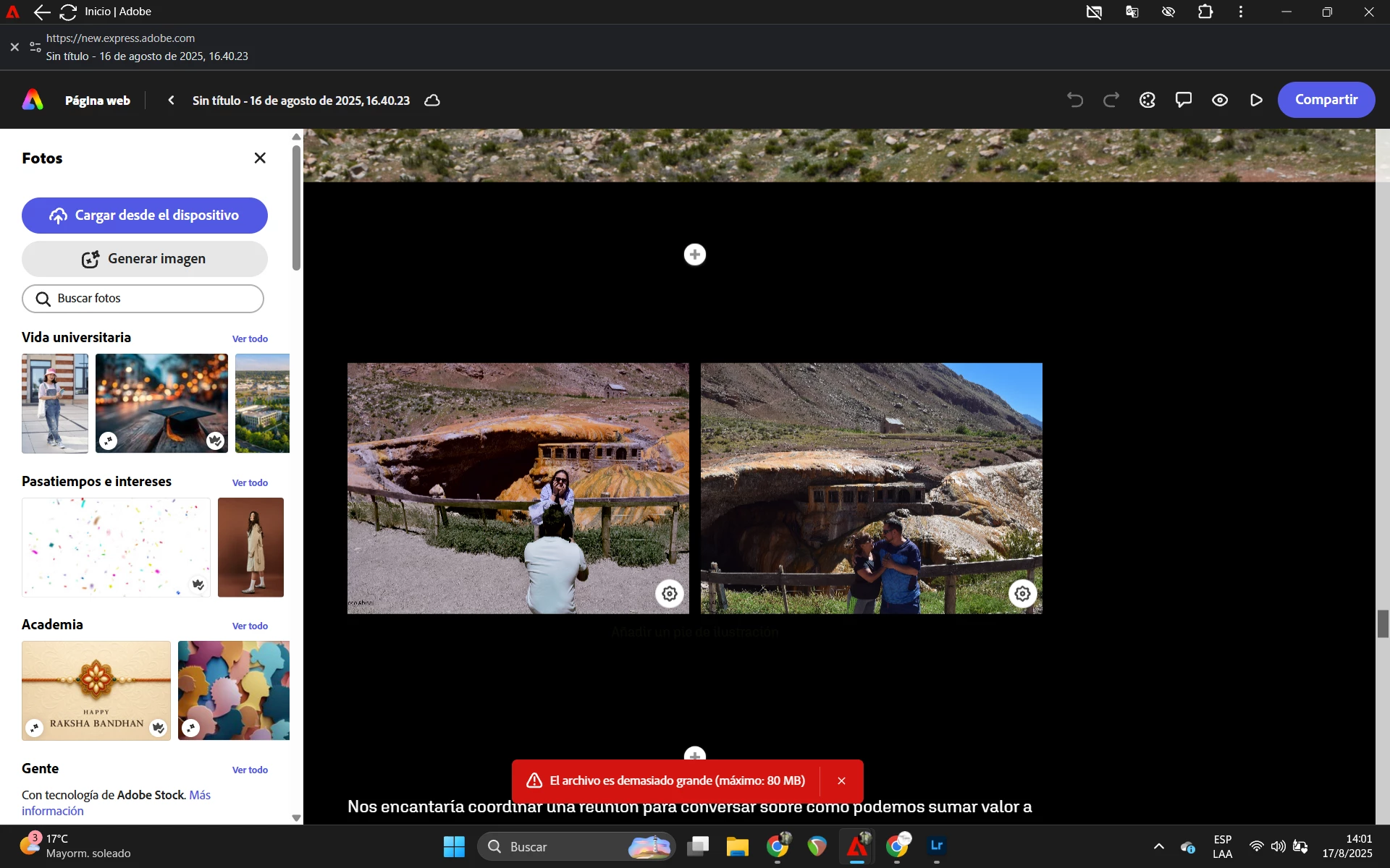 Tengo un problema al intentar cargar imágenes en la creación de un sitio web. La versión Adobe Express que utilizo es la última versión actualizada el 11 de agosto de 2025, desde una PC con windows 10. Tengo Creative Cloud Pro.