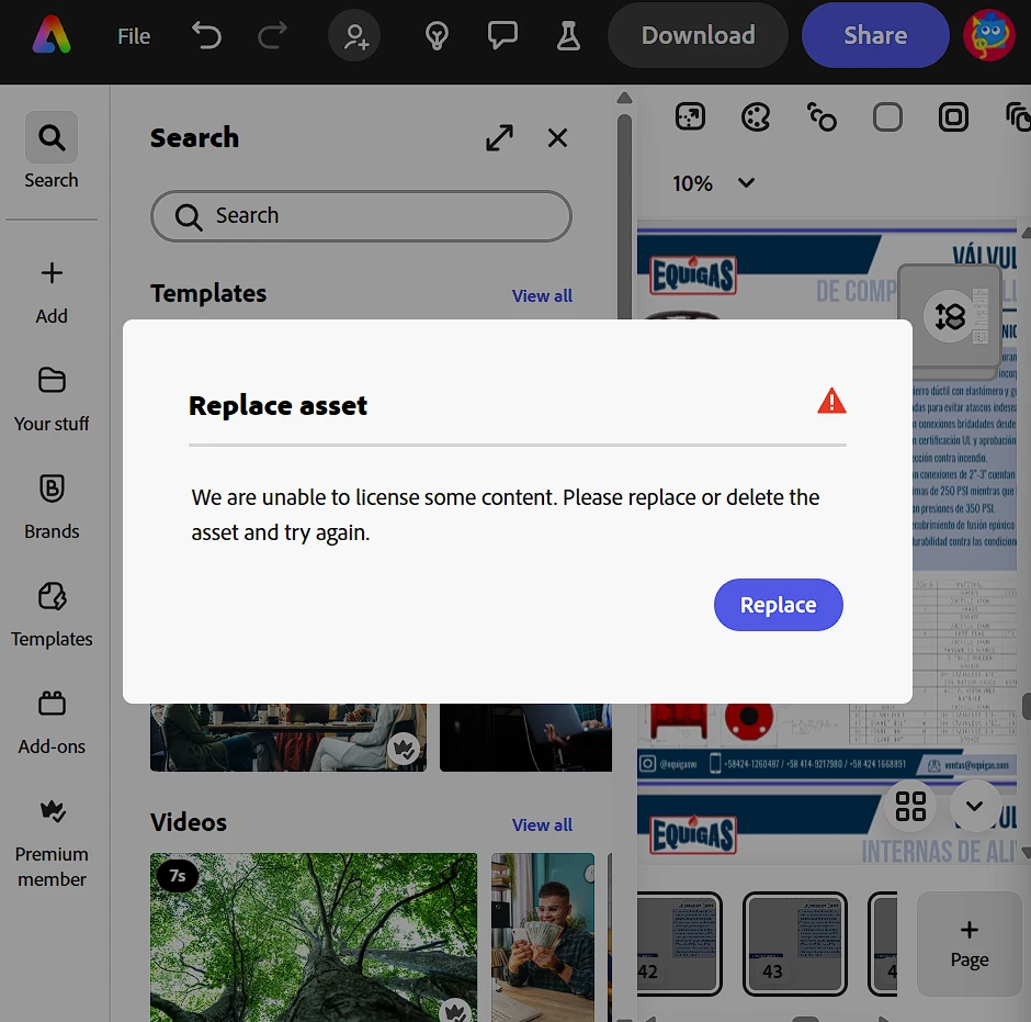 Currently, I'm an Adobe Express Premium Member and I'm not able to download a PNG format. The error message I receive is: "Replace Asset, We are unable to license some content. Please replace or delete the asset and try again" as shown on the attached file. However, on any part of the flyer the asset is identified, and before I could download the same file in any format I required. I need to solve this asap.