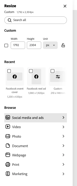 In Express, the default for Facebook post is square, which is incorrect and needs updating. A square post leaves awkward boarders that FB has to fill in. Their standard post dimensions are no longer 1:1, its more 1080x1359. This renders the default social media format selection in Express uselss. Only thing is to create custom format every time you want to create a new facebook post.