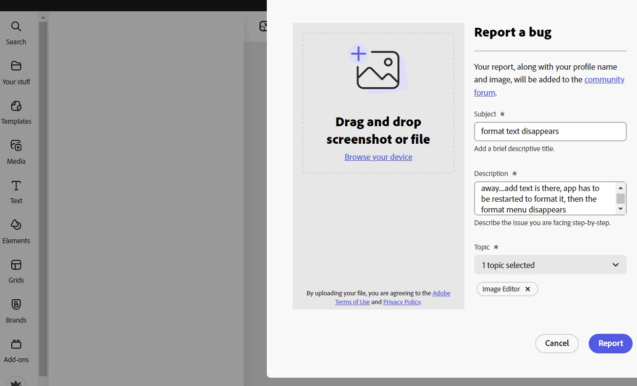 LLorna28687674p6ptParticipantForum|Forum|1 year agoMarch 24, 2024format text disappearsForum|Forum|1 year agoMarch 24, 20241 reply112 viewsthe text formatting keeps going away....add text is there, app has to be restarted to format it, then the format menu disappearsImage EditorDesktop Web