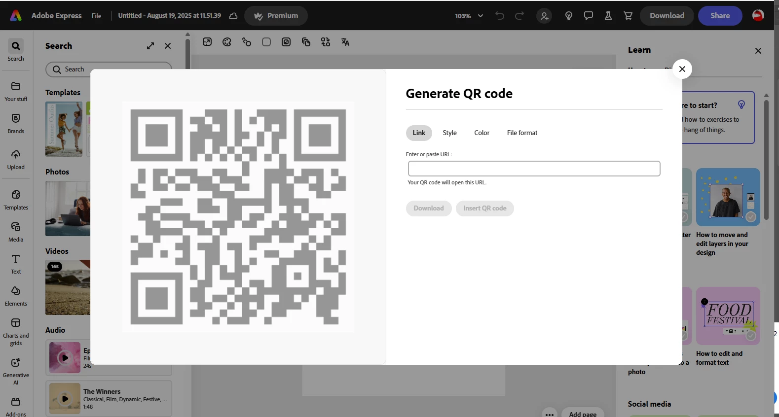 Open or create a document. In the search field, type in "code" and click on "Generate QR Code"