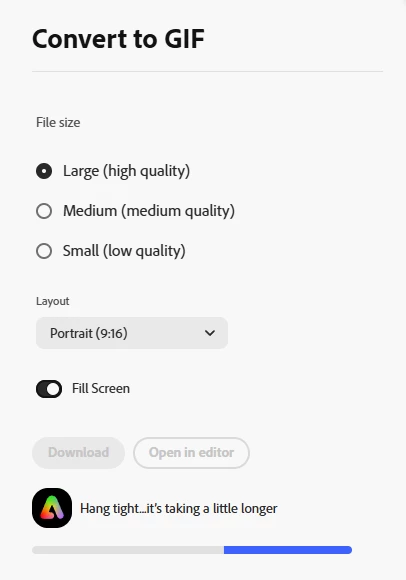 Gif Converter processes my video but the download button is greyed out and doesn’t allow for download. It remains stuck on the “hang in there - it’s taking longer than normal” progress bar. Same issue with the convert to MP4 tool.