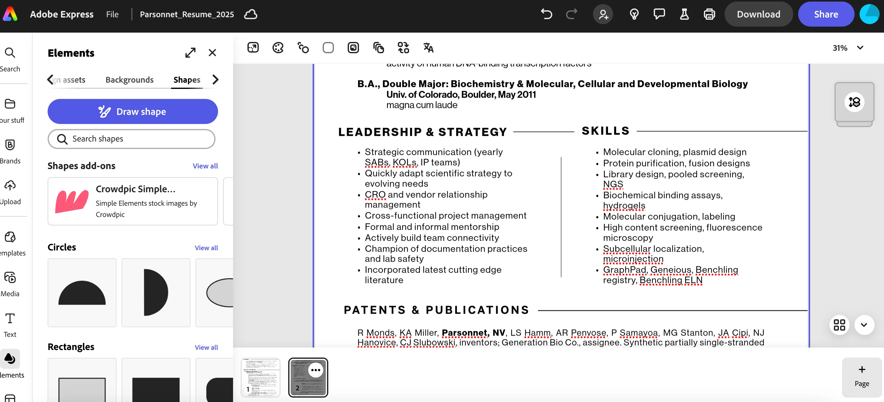 As you can see in the first photo, I have my bulleted text box under 'skills' column as I would like (top and bottom align with column at left). However, when exporting to a PDF, the text jumps and reformats ending up totally different than how I have in my file. I do not have any filters or blending modes on. It's just a simple text box. I've tried restarting web browser. Logging off/in back in and the issues persists. Super annoying glitch