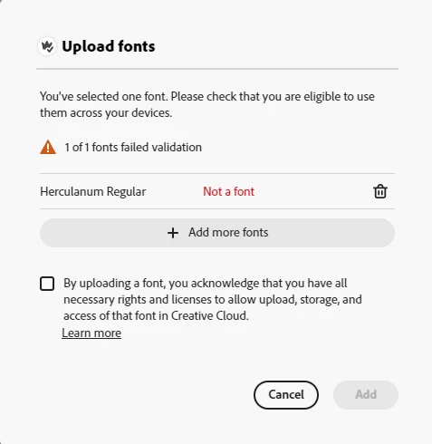 I'm trying to upload a ttf font which works on my PC and in other Adobe apps. Express won't let me upload it, claiming it's "not a font". See screenshots