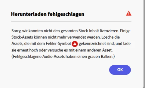 Hallo ich bekomme die Fehlermeldung das ein Stock Inhalt nicht lizensiert werden kann. Ich habe nach dem Ausrufezeichen gesucht aber finde kein Element mit dem Vermerk. Wie bekomme ich meine Datei dennoch gedownloaded werden?