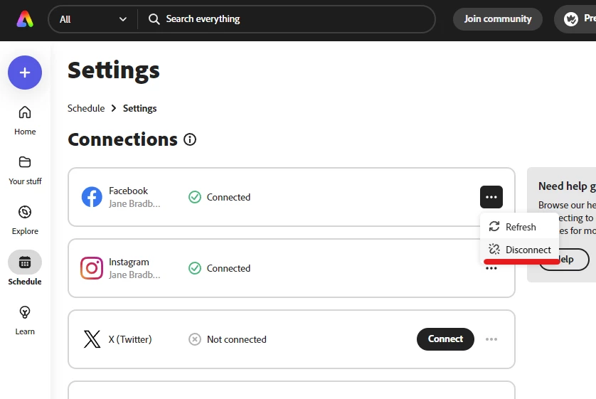 How to switch between different Instagram accounts and Facebook fan pages to post? (Adobe Express)