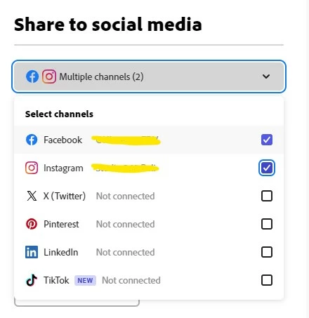ONLY 1 Instagram account and ONLY 1 Facebook fan page can be selected. But if you have several, you want to be able to switch between them so that you can post the posts created with Adobe Express anywhere...