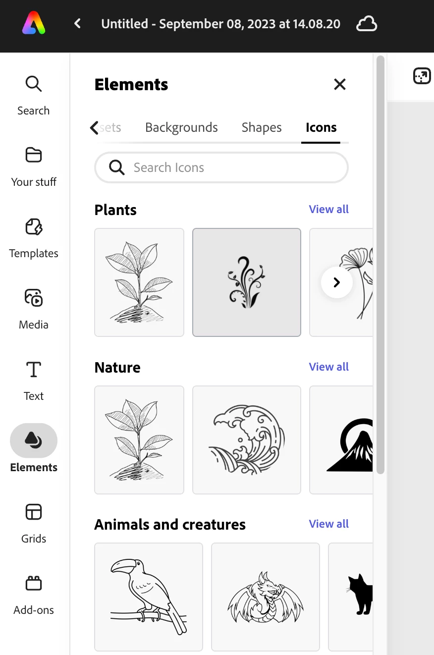 Left side bar > Elements > Icons No thumbnails load. Clicking "View all" on any given section does not load thumbnails. Searching in Icons, results load no thumbnails. Clicking on any non-loaded thumbnails from any area (just Icons section or in search results) does no add any and often results in a "This icon cannot be added. Please try again." Working in Google Chrome, Version 112.0.5615.138. Have set Adobe as an "allow all third-party cookies" in my Chrome settings (including subdomains for Adobe sites).