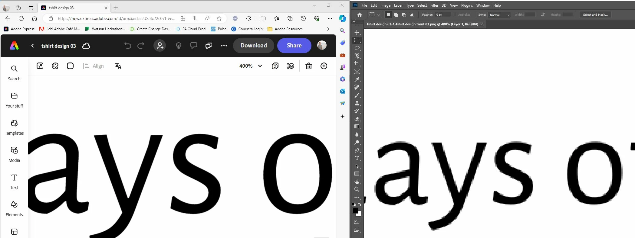 I used Adobe Express to create a tshirt consisting of two pages, front and back of shirt. When downloading the image files from Adobe Express to my desktop the image files (.png) are degraded. We want to keep the quality of the images so that the edges of letters are not pixilated. Please see attached file showing the image in Adobe Epress (left) and downloaded image file (right). How can I download higher resolution images?