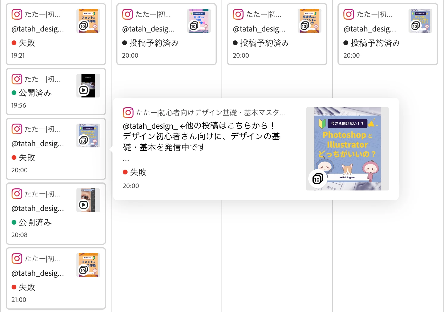 いつもお世話になっております。現在AdobeExpressを使用させていただき、インスタグラムのフィード投稿やストーリーズ投稿などを制作し、インスタグラムんのアカウントと連携して予約投稿を行なっておりましたが、ここ5日ほど連続して予約投稿ができない状態です。メールで「予約投稿ができませんでした」と送られてくるので、その都度、トークンを更新、再投稿をしますがやはり投稿ができません。一度ログアウトして入り直しても予約投稿ができません。別のブラウザを使用してトークンを更新してもやはり投稿ができませんでした。 今までも何回か予約投稿ができない時がありましたが、次の日に同じようにトークンを更新して投稿をすると投稿ができるようになっていましたが、今現在では全く予約投稿ができない状態です。 これは何が原因なのでしょうか? 予約投稿ではないインスタグラムのストーリーズなどは「今すぐに投稿する」で投稿ができます。 予約投稿だけができない状態です。 解決策をご教示いただきたいのと、次にまた予約投稿ができなかった場合の対処方法をご教示いただきたく思います。 何卒よろしくお願いいたします。