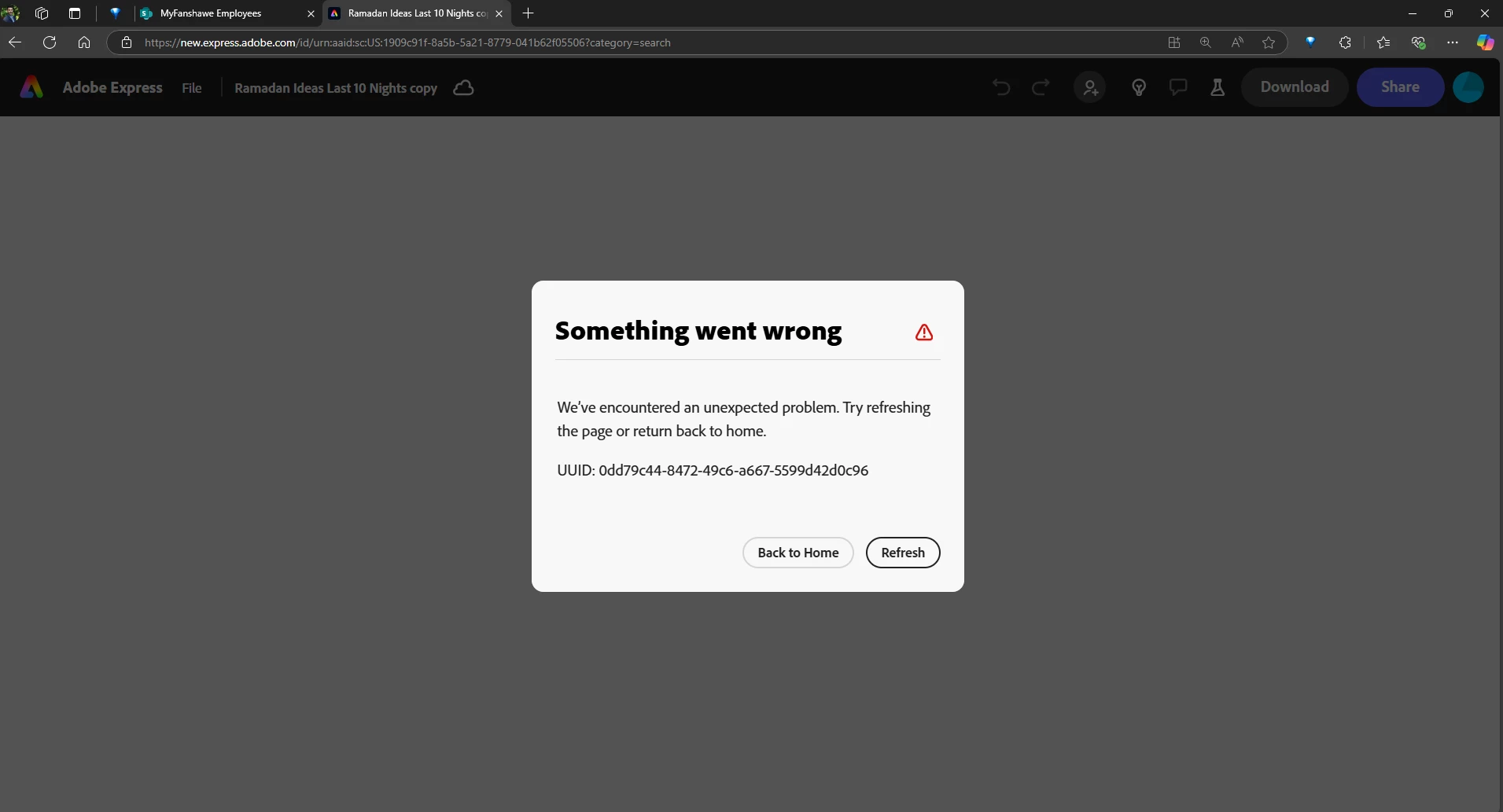 The issue started when I attempted to add a large text to a new page to an existing Adobe Express project. (Project Name: Ramadan Ideas for last 10 nights Copy)