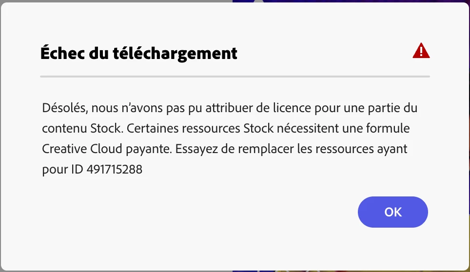 J'essaye d'exporter un projet réalisé sur Adobe Express avec la nouvelle version mais quand je veux exporter un document, il me dit qu'il est impossible de l'exporter car soi-disant, je n'ai pas de licence Adobe Stock inclus dans ma formule Créative Cloud. Ma licence est payée et active depuis plusieurs années et je n'ai jamais rencontré ce problème sur l'ancienne version avec le même projet.