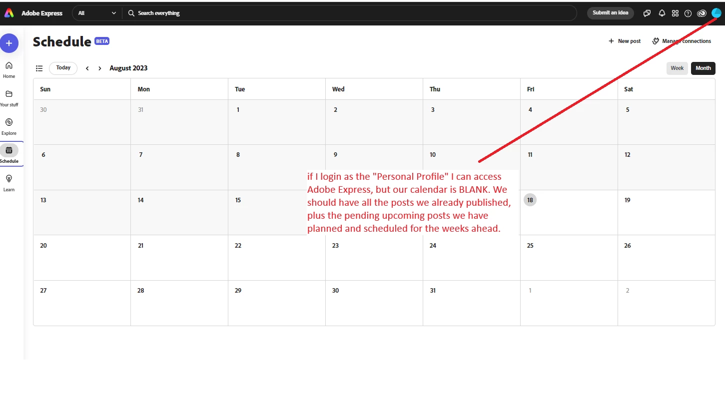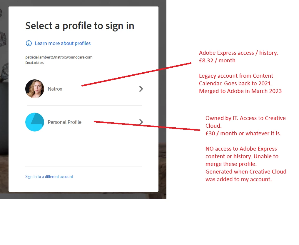 I have 2 Adobe Express profiles, both linked to the same email address. One was my original profile (called Natrox) and has my Adobe Express access that I've been paying for and using for the past 2 years since it was known as Content Calendar. The other profile is my "personal" profile, but it's actually a business profile as well. It was generated when our IT team gave me access to Adobe Creative Cloud to use some programs. They downgraded me from this because I didn't need those programs, and then I lost my Adobe Express access. So they re-upgraded me back to Creative Cloud so I can access Adobe Express, But this week, once again, I am locked out of Adobe Express on my "Natrox" profile. I am paying for the Adobe Express access, and have been for months. I can only the "personal" profile, but none of the social posts we have scheduled in Adobe Express show up on that profile. I have dozens of social posts coming up in the next 2 months that are pending, and I'm locked out of being able to edit/access them etc. I need these 2 profiles to be merged, and I don't want to lose access to the content that is pending on the Adobe Express "Natrox" profile. Please help. Your BETA version of Adobe Express is driving me crazy this month losing access and having zero support on this. Waiting for help. Patricia - patricia.lambert@natroxwoundcare.com