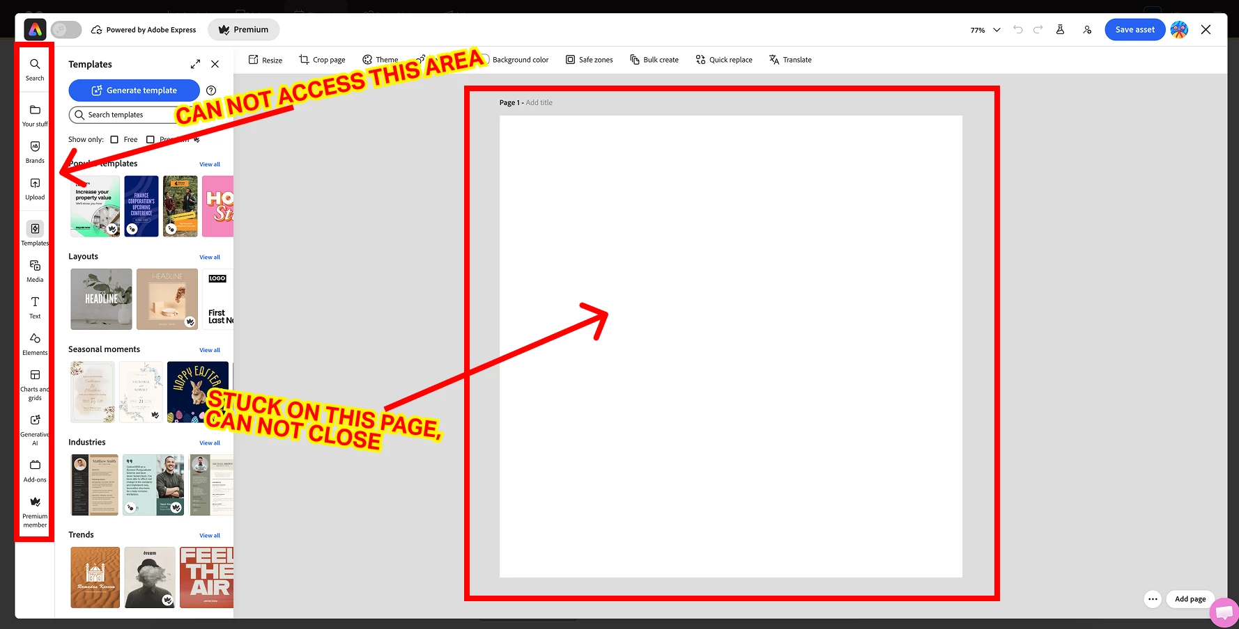 While using the Adobe Express integration within the Metricool planner, the editor has become unresponsive. I am currently "stuck" on a specific template and unable to interact with the left-hand navigation bar.