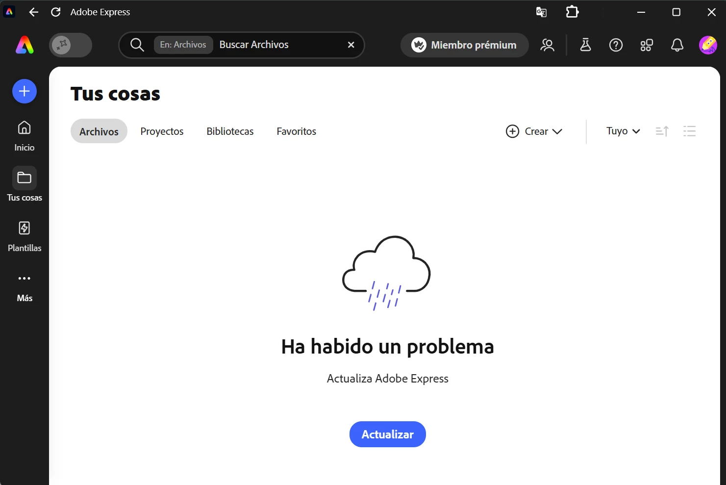 Da error al cargar “Mis cosas”, tanto en el navegador web como en la app de Windows.