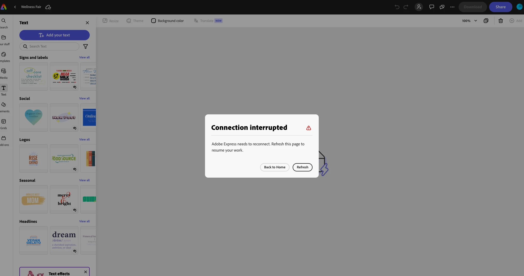 After refreshing several times I cannot get access to my file https://new.express.adobe.com/id/urn:aaid:sc:VA7:2af87b67-f79c-5efe-a38b-9f51d7e27af7?category=text