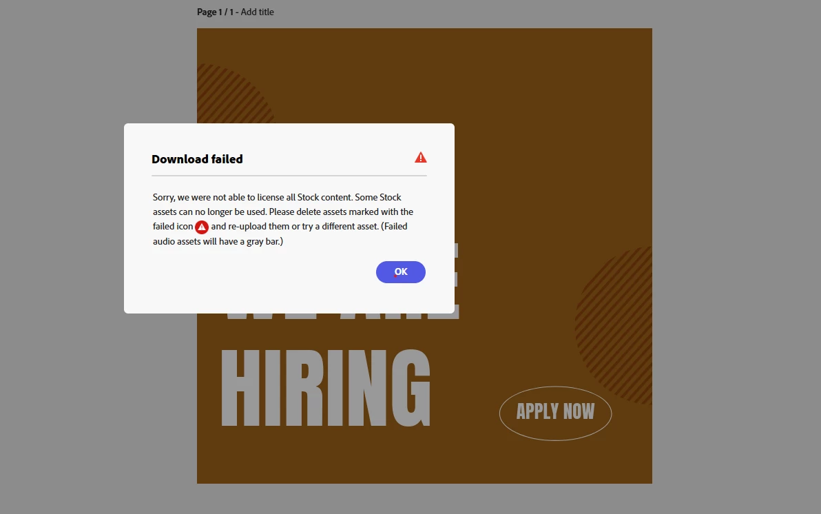 I got this message on a design. Not able to download it! At first I had my logo and got the same message. Removed the logo and still get the message. I need to download this for a school assignment! What needs to be licensed in this photo there is no red icon nowhere on the design.