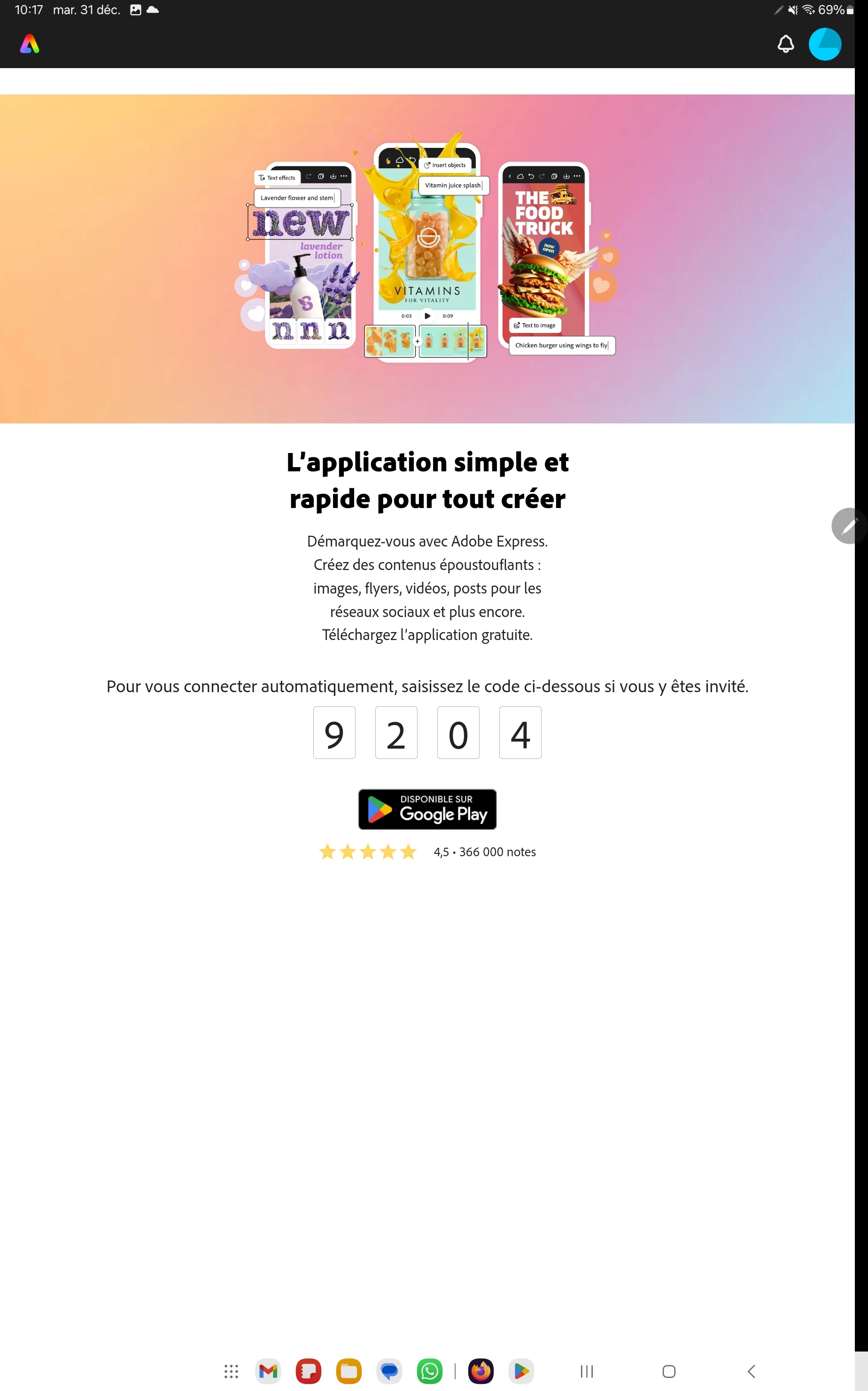 Bonjour, après l’installation de adobe express sur ma tablette samsung s10 ultra, je me connecte et ça me renvoi directement un code et d’installer l’application.