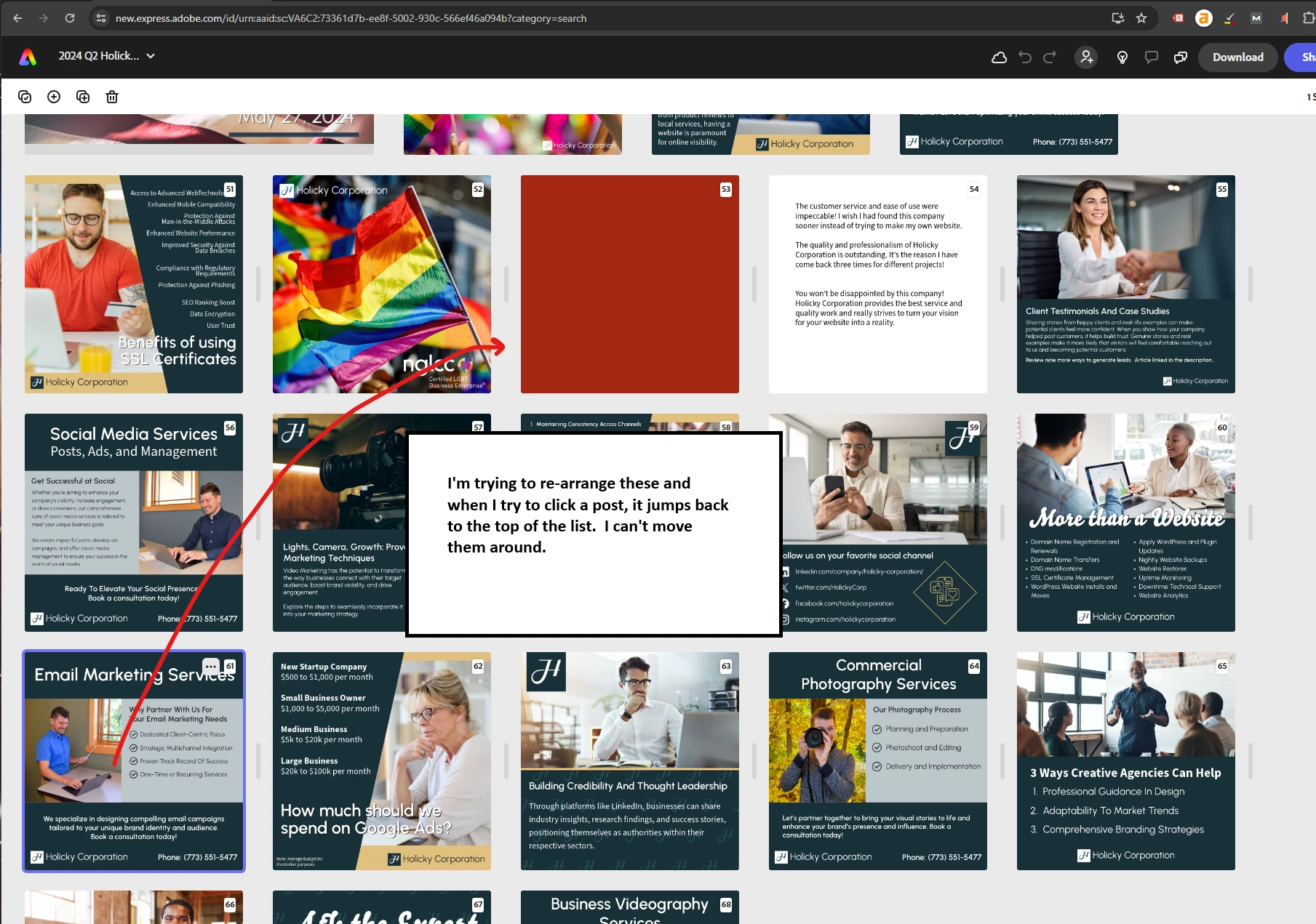 Jason HolickyParticipating FrequentlyForum|Forum|1 year agoMay 17, 2024rearranging postsForum|Forum|1 year agoMay 17, 20241 reply164 viewswhen trying to re-arrange the posts in the list, it doesn't work. I click a post and the screen scrolls back to the top. See screenshot. please fix, this is frustrating. I tried it on both the desktop app and web version and the same issue happens.Multi-PageDesktop WebPerformance