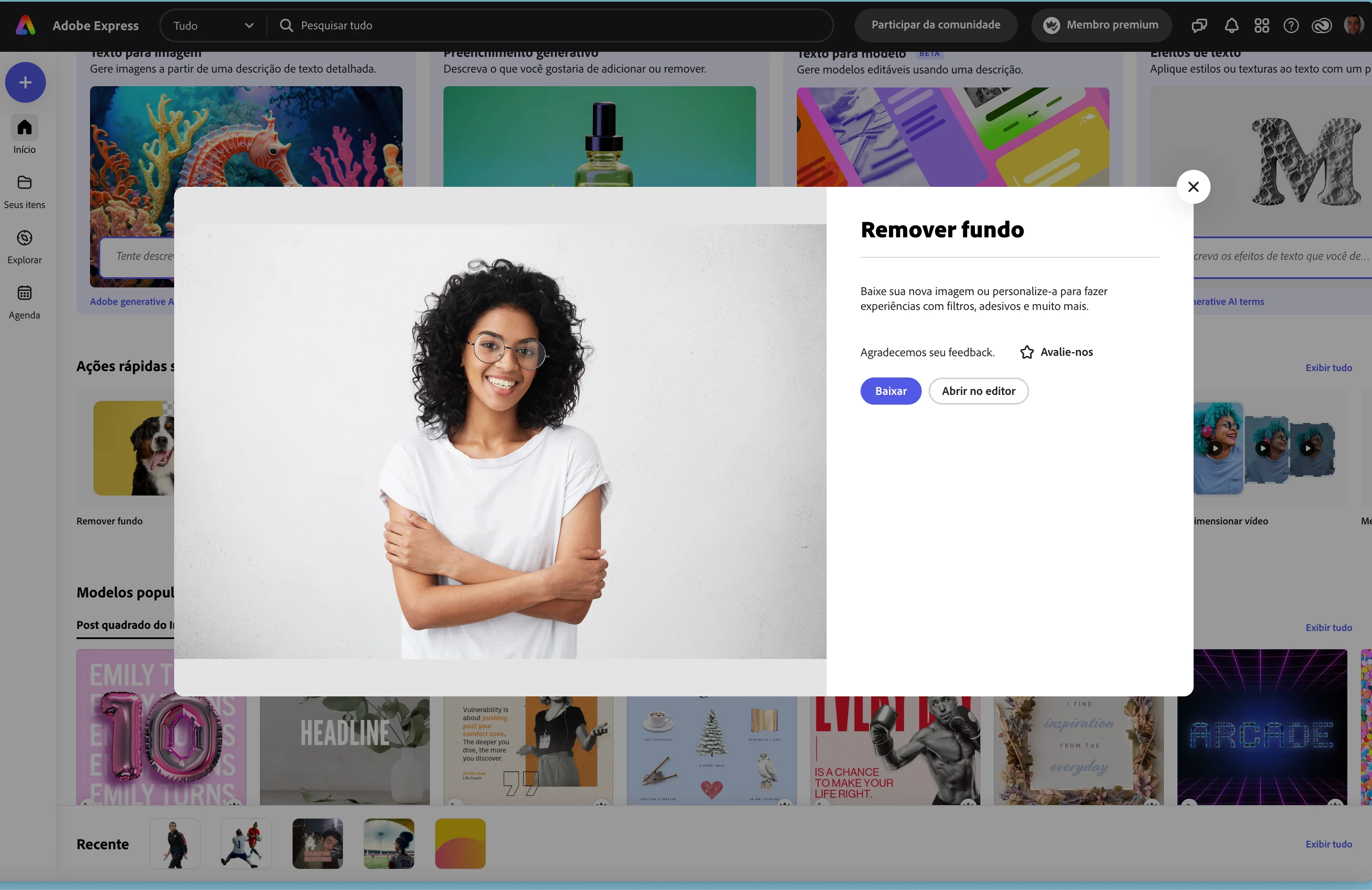 A função remover fundo pressente no Adobe Express não está a funcionar. Ontem quando fazia upload da imagem, aparecia logo cortar para depois fazer o download. Hoje simplesmente dá a mesma imagem só que em .png