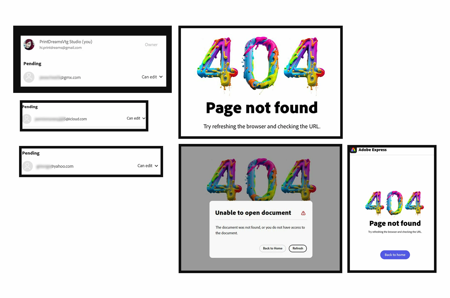 I am experiencing issues sharing templates with my clients, especially those using Yahoo, mxg, and iCloud email addresses. They primarily use these emails and do not have other accounts. Can you fix this error to improve the user experience? If not, could you provide a solution to make it easier for clients to access and edit the templates? There have been numerous complaints, and I am facing serious problems because of this. To clarify, this is what happens: I share the template with the email provided by the client. They receive the collaboration invite, click to access the template, and encounter an error. On my end, it shows as pending, as if the client did not accept the collaboration, but they have. They also attempt to log in through the Adobe Express platform using their email and continue to receive errors (screenshots attached). Notably, there are no issues with clients using Gmail. I appreciate your prompt response, Adobe Express team