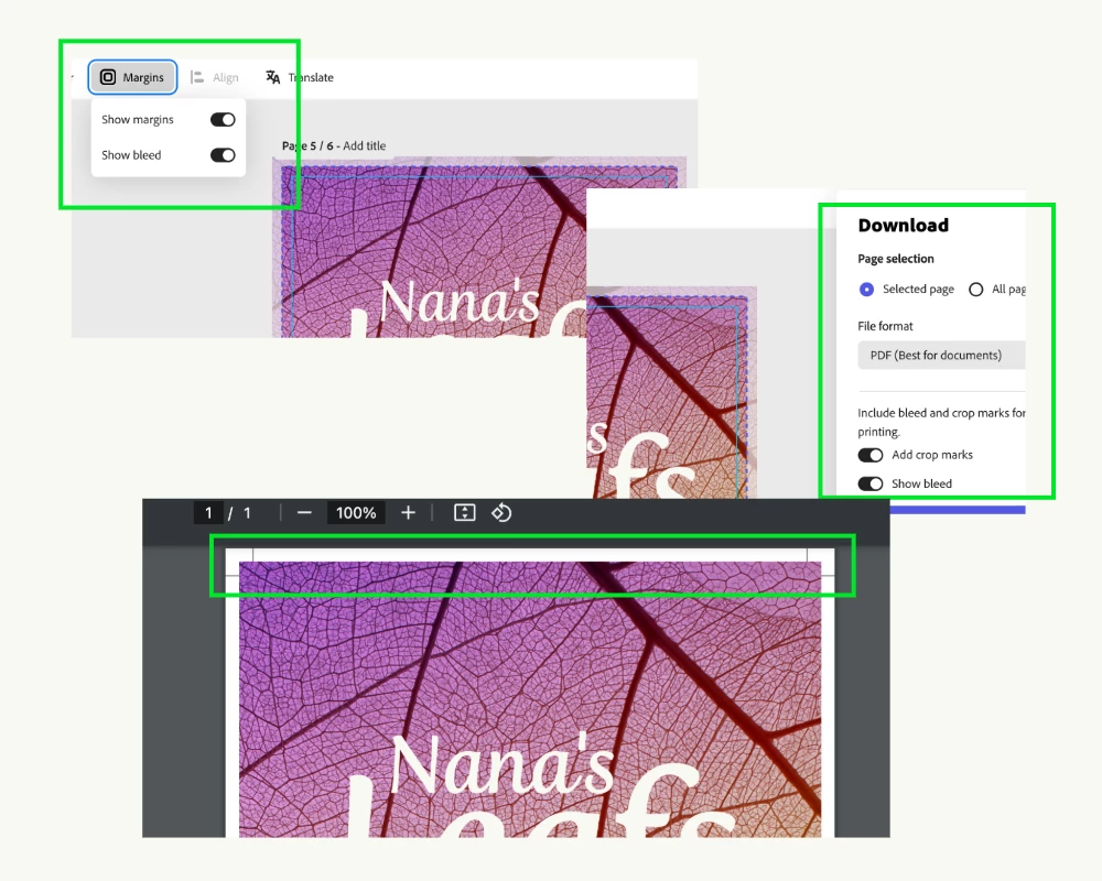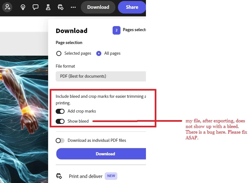 I created a beautiful business card for one of my clients (I can use InDesign) but decided to try Adobe Express it could be easier with the number of photos and design assets available. I didn't realize that my print-ready file did not show a bleed, as my commercial printer required to ensure there was no white border around it. How are we supposed to use this to design print items if this feature does not work? Also, they don't seem to convert within the platform to CMYK. I know we can do this afterward in Adobe Pro DC, but it would be nice if this was built in as most commercial printers require CMYK and bleed cropmarks. The "show bleed" feature is broken in the Adobe Express desktop platform. Please fix this bug soon. Here are some screenshots of what I mean.