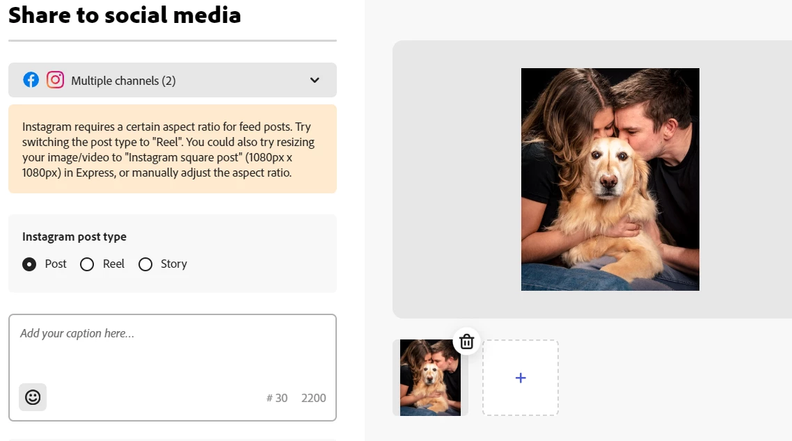 I'm getting a warning saying IG requires a certain aspect ratio for its feed, which is incorrect. I've attached a capture of the warning, as well as the info Adobe Express provides showing that a 4:5 ratio is accepted. 4:5 is the ratio I'm trying to post.