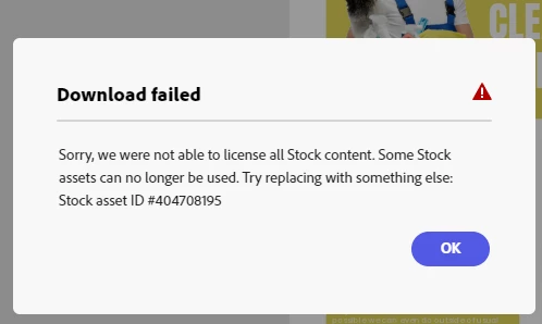 I used a template and designed a brochure. While downloading the brochure, it gives error message as attached .The asset ID to be replaced does not match the asset and non existent.