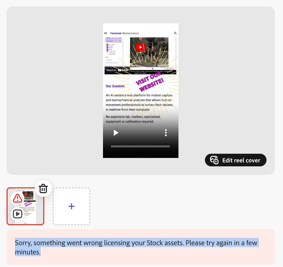I have Adobe Express Premium and am unable to schedule a post including a stock Thanksgiving video for my business. Error message below happens when attempting to post from the web host. If anyone has any input I'd appreciate it.